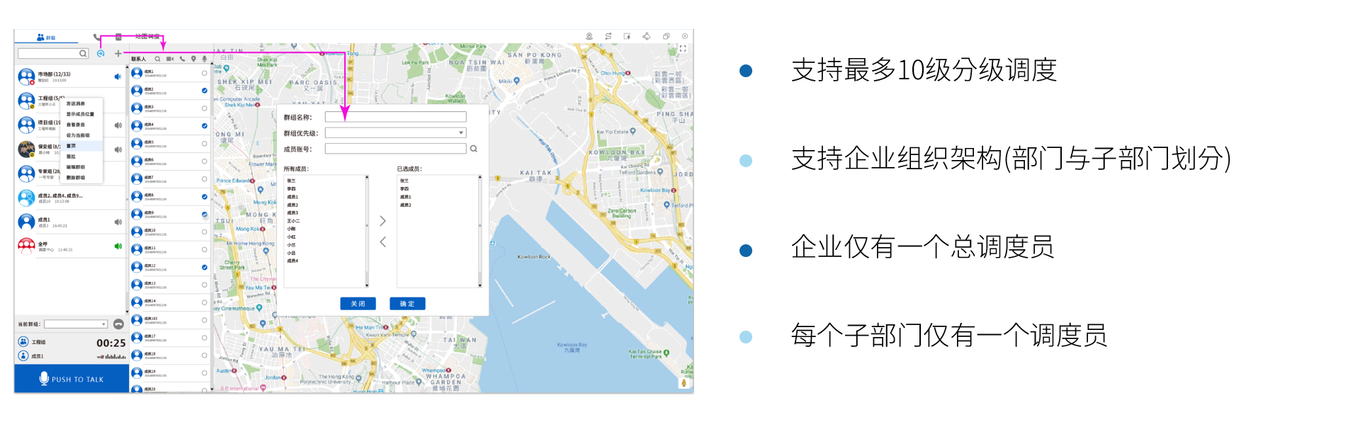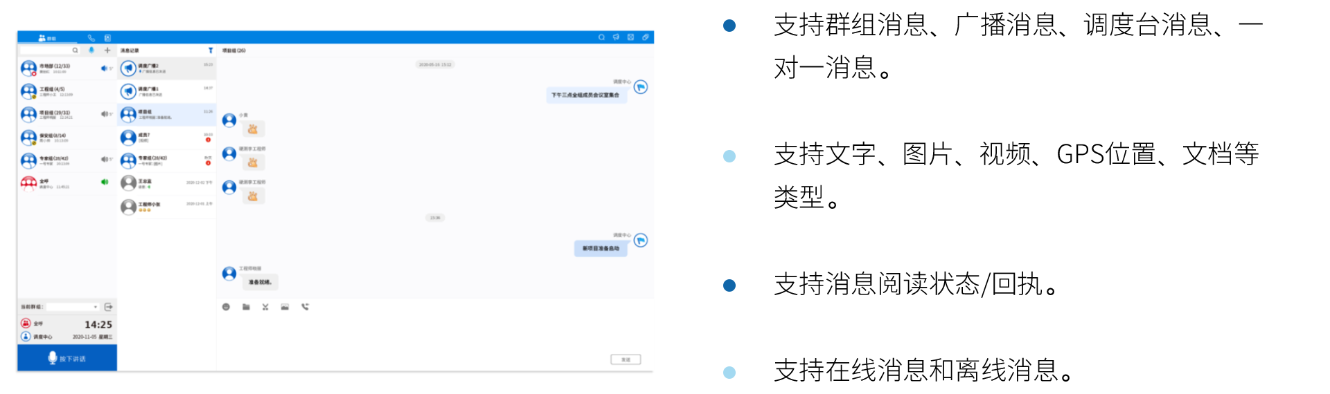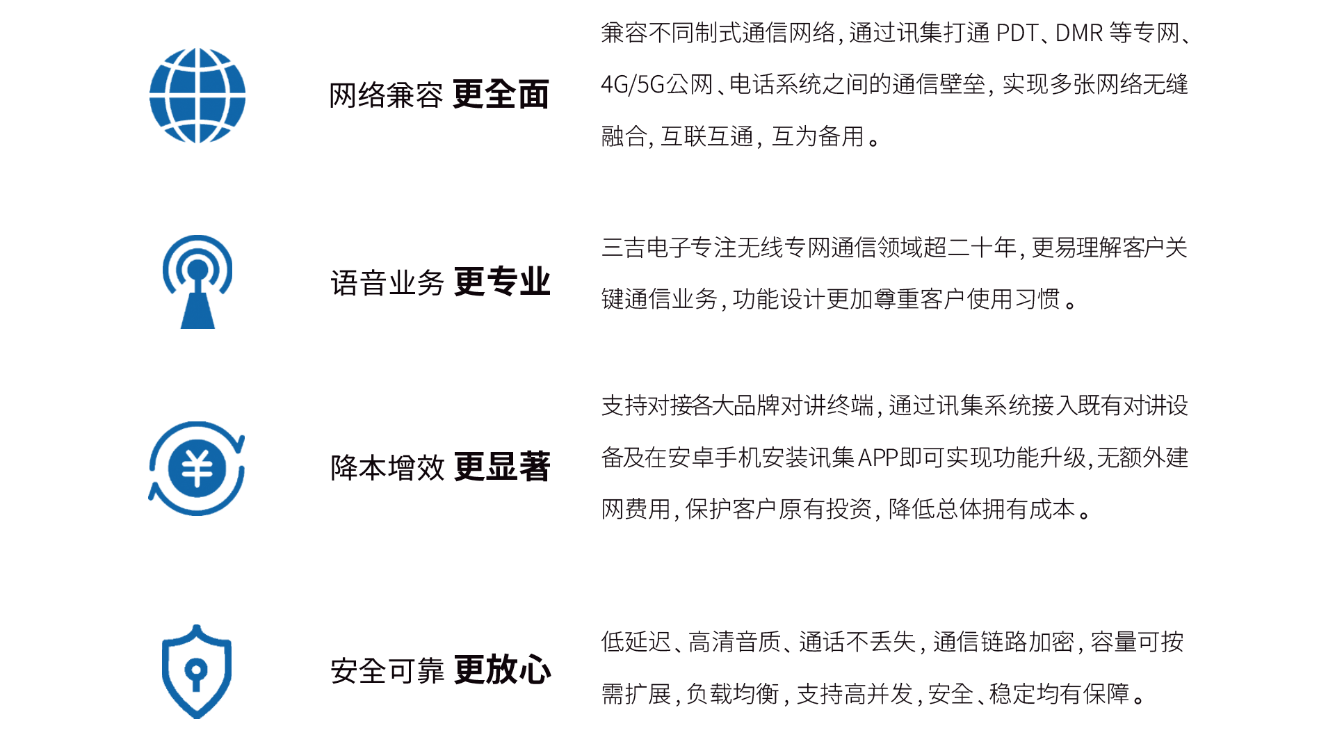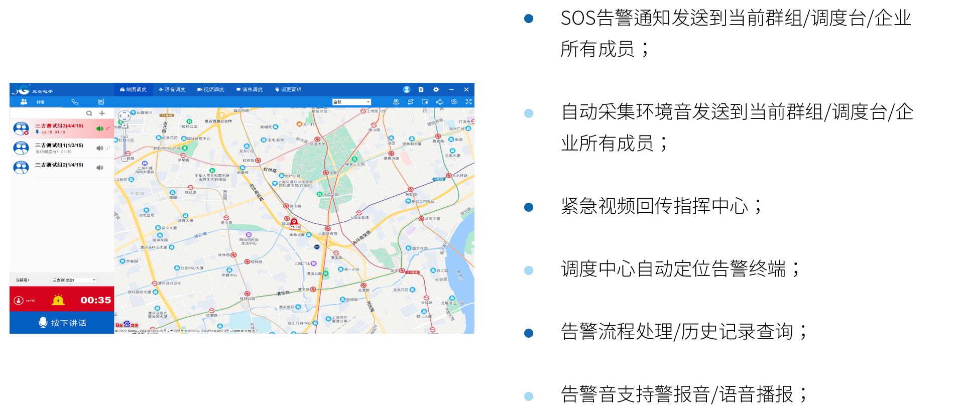 三吉讯集公专对讲系统 是以高效实时音视频通信为核心业务,以地图定位、多媒体消息、SOS紧急报警、巡更巡检等行业应用为延伸的一体化综合调度通信系统。 有效融合PDT、DMR、4G/5G、PSTN等不同通信网络制式,帮助行业用户在同一平台、多形态终端上实现语音对讲、数据传输、多样化智能应用,提升调度业务和工作协同效率。